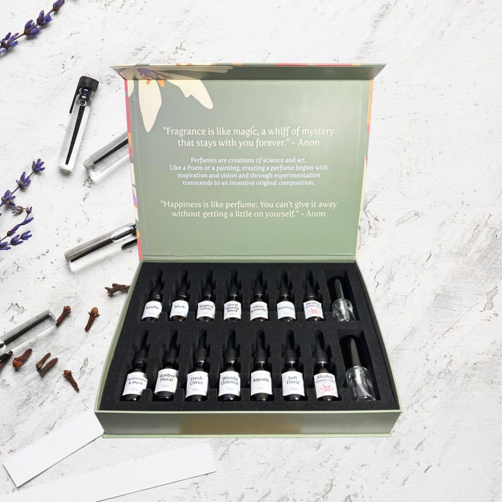 Fragrance Lab in a Box uses professional perfume ingredients and raw materials, commonly found in luxury perfumes. These include Frankincense, patchouli, Amber Floral, Musk, Tropical Citrus, Bergamot, Leather, Sandalwood, Vetiver, Peony, Thyme and more. All ingredients are carefully inspected and provided by Tijon.